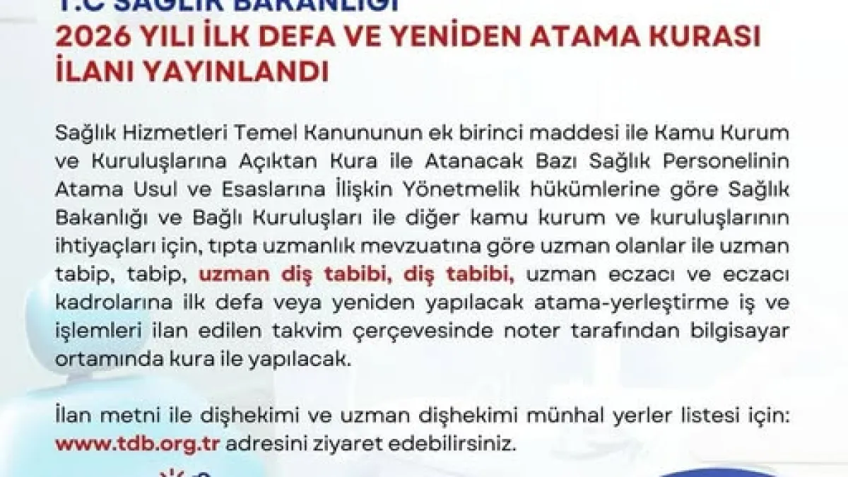 Sağlık Bakanlığı, tıpta uzmanlık mevzuatına göre uzman olan ve olmayan sağlık personeli için 2026 yılı ilk defa ve yeniden atama kurası ilanını resmi olarak yayınladı. Bu kapsamda, uzman dişhekimi ve dişhekimi kadroları da atama takvimine dahil edildi. Yerleştirme işlemleri, ilan edilen takvim doğrultusunda noter huzurunda bilgisayar ortamında gerçekleştirilecek kura ile yapılacak.
