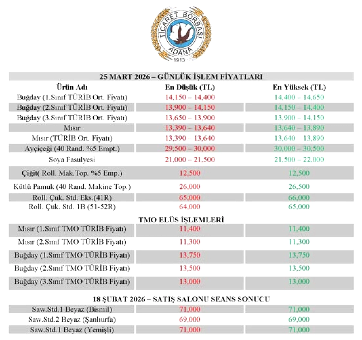 Adana Ticaret Borsası (ATB), 25 Mart 2026 Çarşamba gününe ait günlük tarım ürünleri işlem fiyatlarını açıkladı.