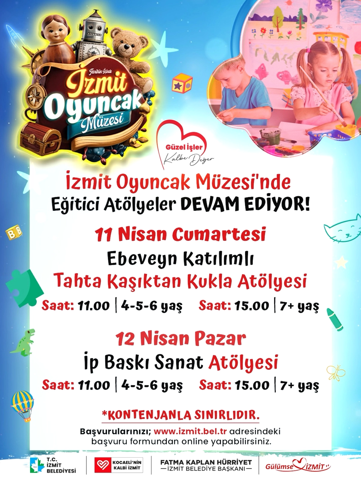 Kontenjanın sınırlı olduğu atölyelere katılım için başvurular İzmit Belediyesi'nin resmi internet sitesi www.izmit.bel.tr üzerinden yapılıyor. Etkinlikler, İzmit Oyuncak Müzesi'nin Sevgi Mahallesi'ndeki merkezinde gerçekleştirilecek.