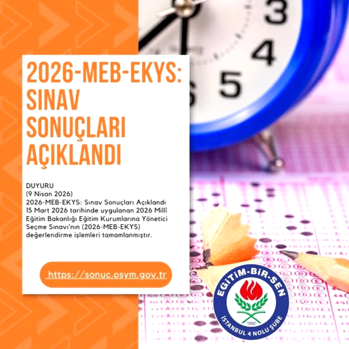Eğitim-Bir-Sen İstanbul 4 Nolu Şube, sınav sonuçlarının açıklanmasının ardından bir mesaj yayınladı. Mesajda, "Eğitim-Bir-Sen olarak, sınava giren tüm adaylarımızın verdikleri emeğin karşılığını almalarını temenni ediyor, yanında olduğumuz tüm eğitim çalışanlarımıza süreçte başarılar diliyoruz" ifadelerine yer verildi.