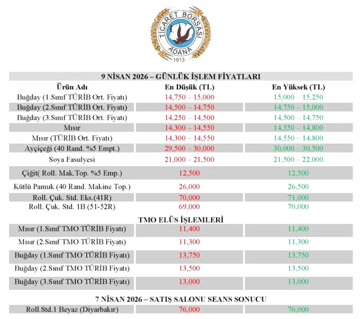 Adana Ticaret Borsası, 9 Nisan 2026 Perşembe günü gerçekleşen günlük işlem fiyatlarını açıkladı. Borsa Yönetim Kurulu Başkanı Şahin Bilgiç liderliğindeki kurum, bölgenin tarım ürünleri piyasasındaki hareketliliği yansıtan bu verileri düzenli olarak paylaşıyor.