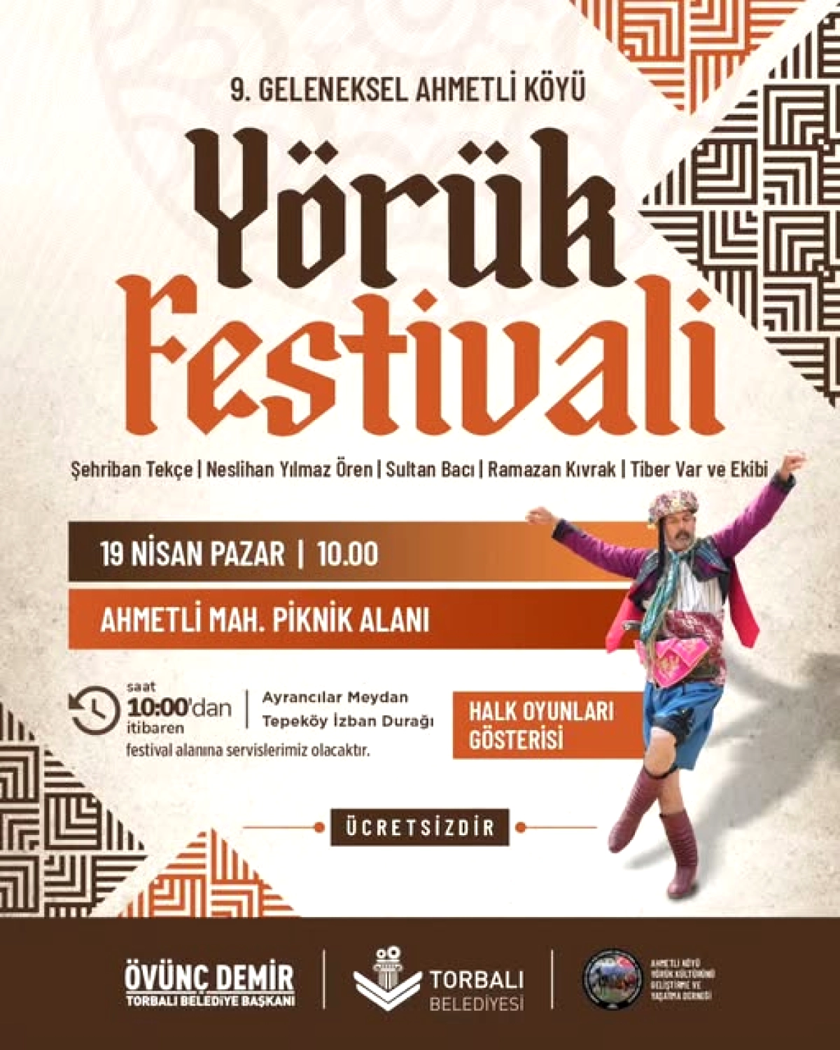 Torbalı Belediyesi, geleneksel kültürün yaşatılması amacıyla bu yıl 9.'sunu düzenleyeceği Ahmetli Köyü Yörük Festivali için hazırlıklarını tamamladı. 19 Nisan 2026 Pazar günü saat 10.00'da Ahmetli Köyü Piknik Alanı'nda başlayacak olan festival, renkli görüntülere sahne olacak.