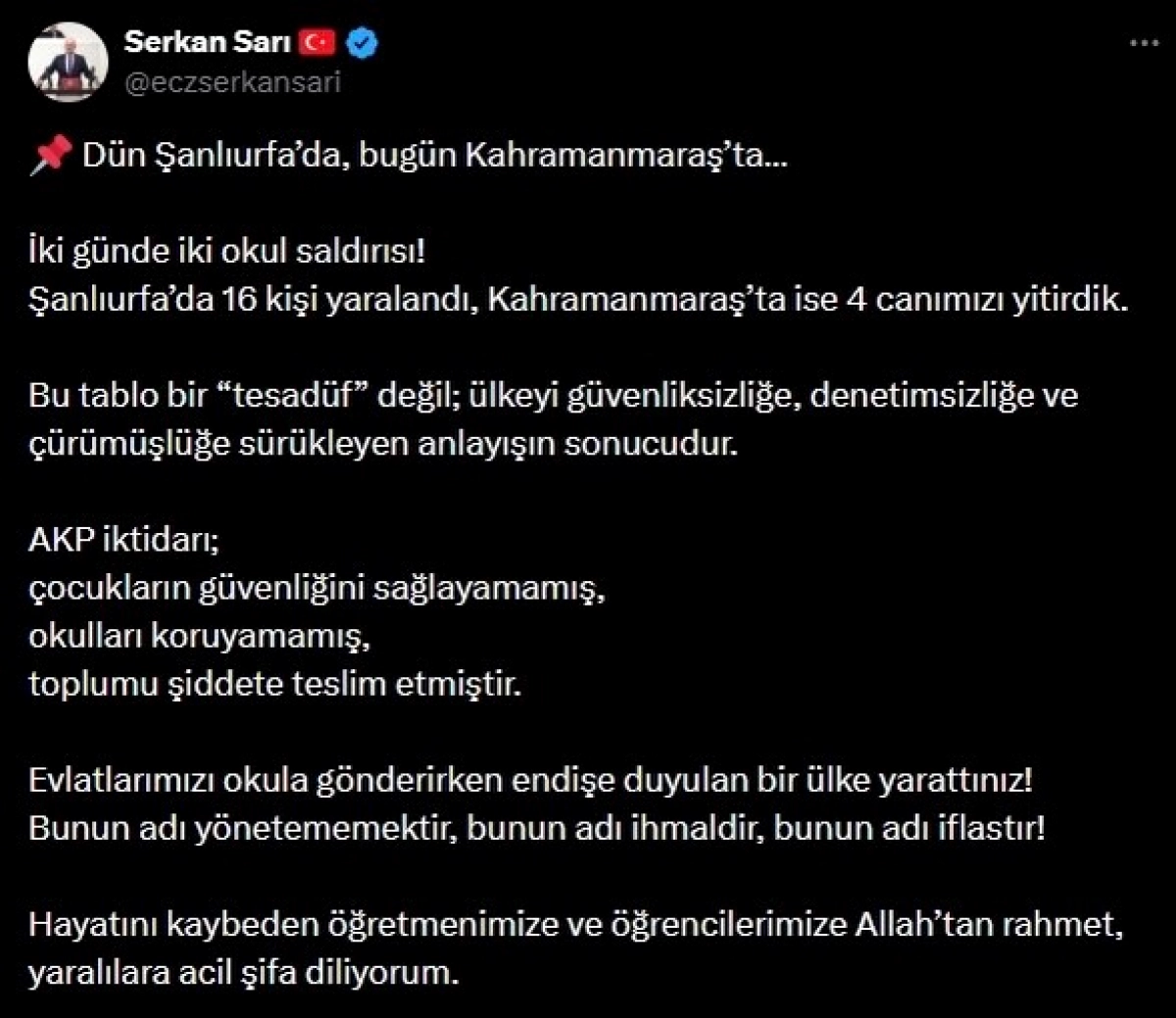 CHP Balıkesir Milletvekili Serkan Sarı, son iki günde Şanlıurfa ve Kahramanmaraş'ta meydana gelen okul saldırılarına ilişkin sert bir açıklama yaptı. Sarı, 14 Nisan'da Şanlıurfa'da 16 kişinin yaralandığı ve 15 Nisan'da Kahramanmaraş'ta 4 kişinin hayatını kaybettiği saldırıları "tesadüf olmayan bir tablo" olarak nitelendirdi.