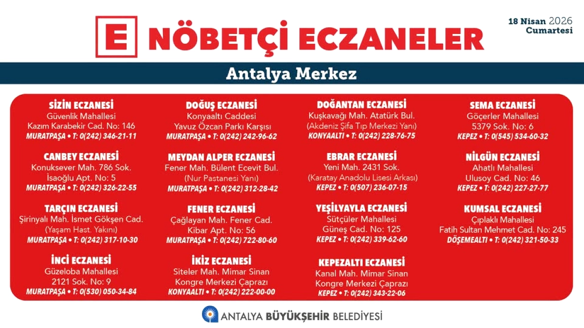 Antalya'da nöbetçi eczane hizmeti, şehrin tüm ilçelerinde düzenli olarak organize ediliyor. Muratpaşa, Kepez, Konyaaltı başta olmak üzere Alanya, Manavgat, Serik ve diğer ilçelerde vatandaşların gece saatlerinde de ilaç temin edebilmeleri sağlanıyor. Öne çıkan nöbetçi eczaneler arasında Beyaz Eczanesi (Alanya) ve Parlayüksel Eczanesi (Alanya) yer alıyor. Beyaz Eczanesi 0 (242) 515-44-44 numarasından, Parlayüksel Eczanesi ise 0 (242) 502-48-40 numarasından ulaşılabilir durumda.