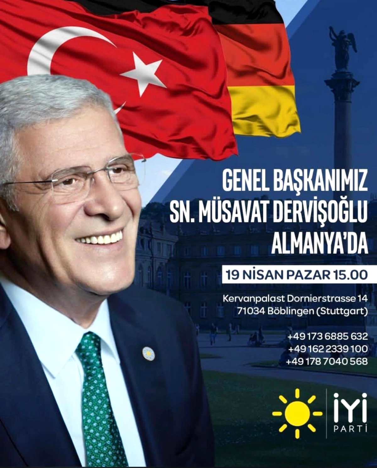 İYİ Parti Genel Başkanı Müsavat Dervişoğlu, yarın (19 Nisan 2026 Pazar) Almanya'nın Stuttgart kentinde Avrupalı Türklerle buluşacak. Partinin Adana Milletvekili Dr. Ayyüce Türkeş Taş tarafından yapılan duyuruda tüm vatandaşlar etkinliğe davet edildi.