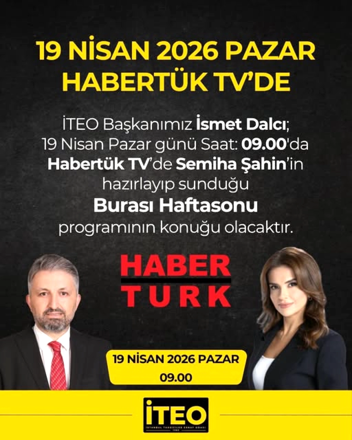 İstanbul Taksiciler Esnaf Odası Başkanı İsmet Dalcı, 19 Nisan 2026 Pazar günü saat 09:00'da Habertürk TV ekranlarında izleyicilerle buluşacak. Dalcı, Semiha Şahin'in sunduğu Burası Haftasonu programının konuğu olacak.