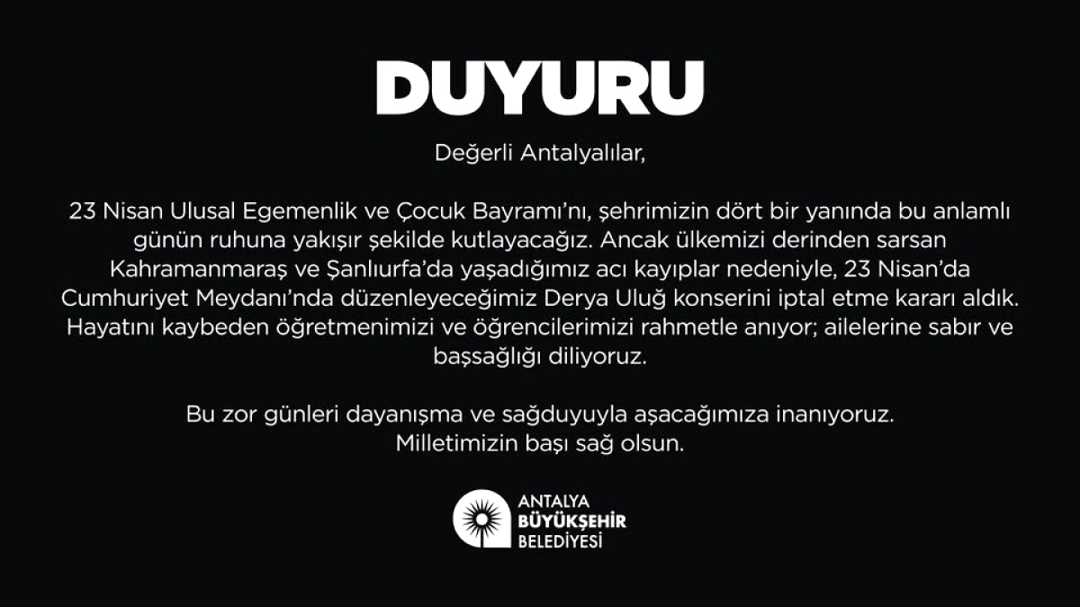 Belediye tarafından yapılan açıklamada, "Ülkemizi derinden sarsan Kahramanmaraş ve Şanlıurfa'daki acı kayıplar nedeniyle 23 Nisan'da Cumhuriyet Meydanı'nda düzenleyeceğimiz Derya Uluğ konserini iptal etme kararı aldık" ifadelerine yer verildi. Açıklamada hayatını kaybeden öğretmen ve öğrenciler rahmetle anılırken, ailelerine sabır ve başsağlığı dilendi.