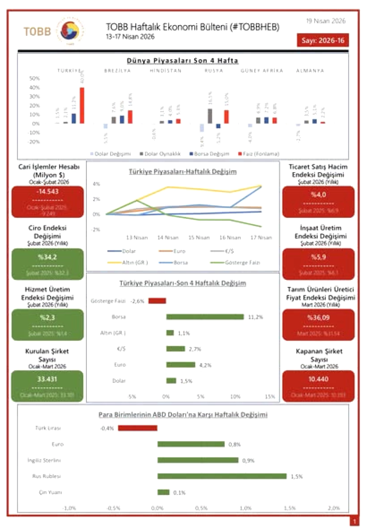 Türkiye Odalar ve Borsalar Birliği (TOBB), 13-17 Nisan 2026 haftasına ait ekonomik gelişmeleri derleyen Haftalık Ekonomi Bülteni'ni (TOBBHEB) yayımlamıştı. Söz konusu bülten, Gaziantep Ticaret Borsası dahil olmak üzere ülke genelindeki ticaret odaları ve borsalar tarafından yakından takip ediliyor.