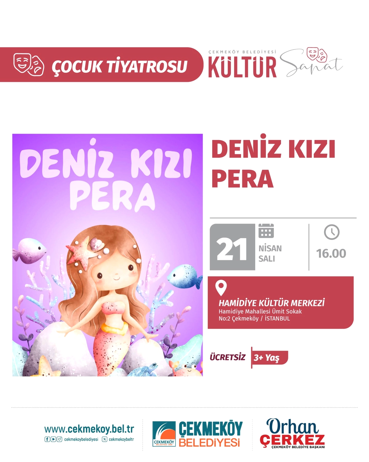 Deniz Kızı Pera oyunu 21 Nisan Salı günü saat 16:00'da Hamidiye Kültür Merkezi'nde sahnelenecek. Çekmeköy Belediyesi'nin düzenlediği etkinlik, aileler ve çocuklar için ücretsiz olarak sunuluyor.