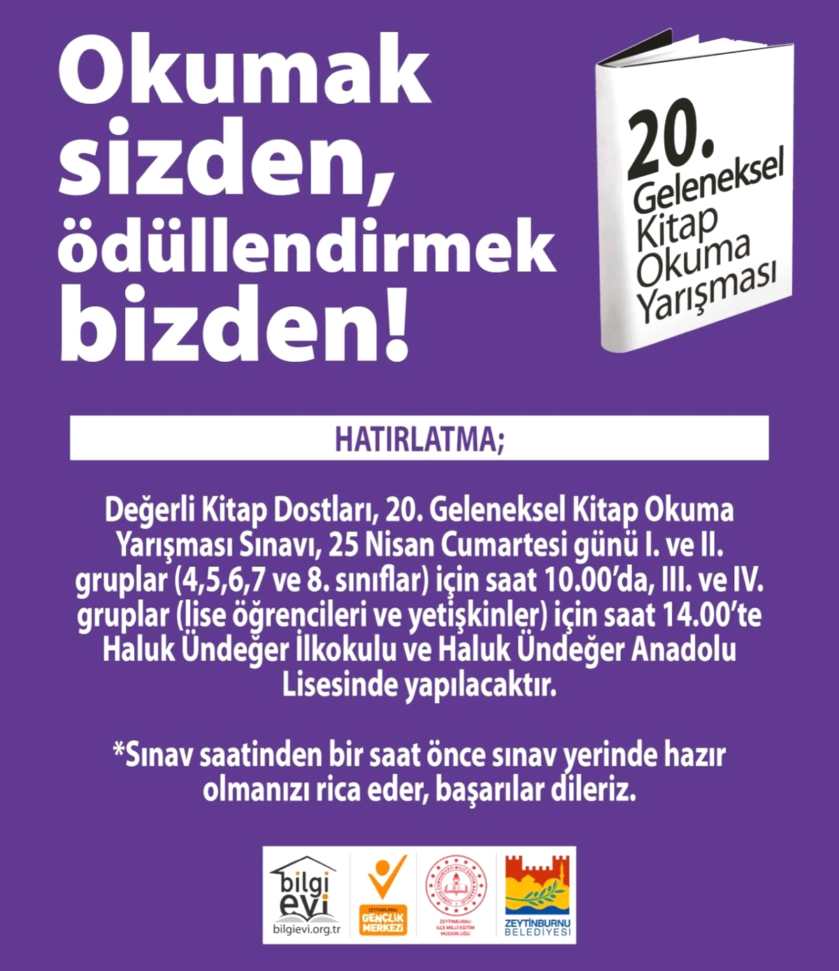 Zeytinburnu Belediyesi tarafından düzenlenen geleneksel Kitap Dostları Sınavı için geri sayım başladı. İlçedeki öğrencilerin kitap okuma alışkanlığını teşvik etmek amacıyla düzenlenen sınav, 25 Nisan Cumartesi günü iki farklı seansta yapılacak.