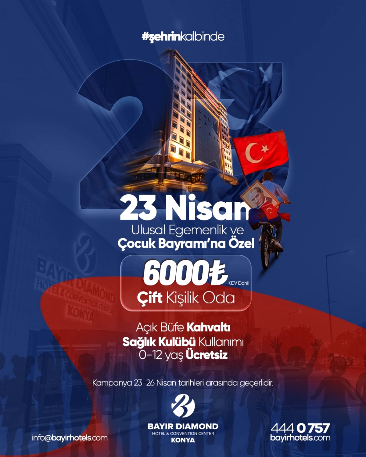 Bayır Diamond Hotel & Convention Center, 23 Nisan Ulusal Egemenlik ve Çocuk Bayramı nedeniyle özel bir konaklama kampanyası düzenliyor. 23-26 Nisan 2026 tarihleri arasında geçerli olacak kampanyada 0-12 yaş arası çocuklar ücretsiz konaklama imkanından yararlanabilecek.