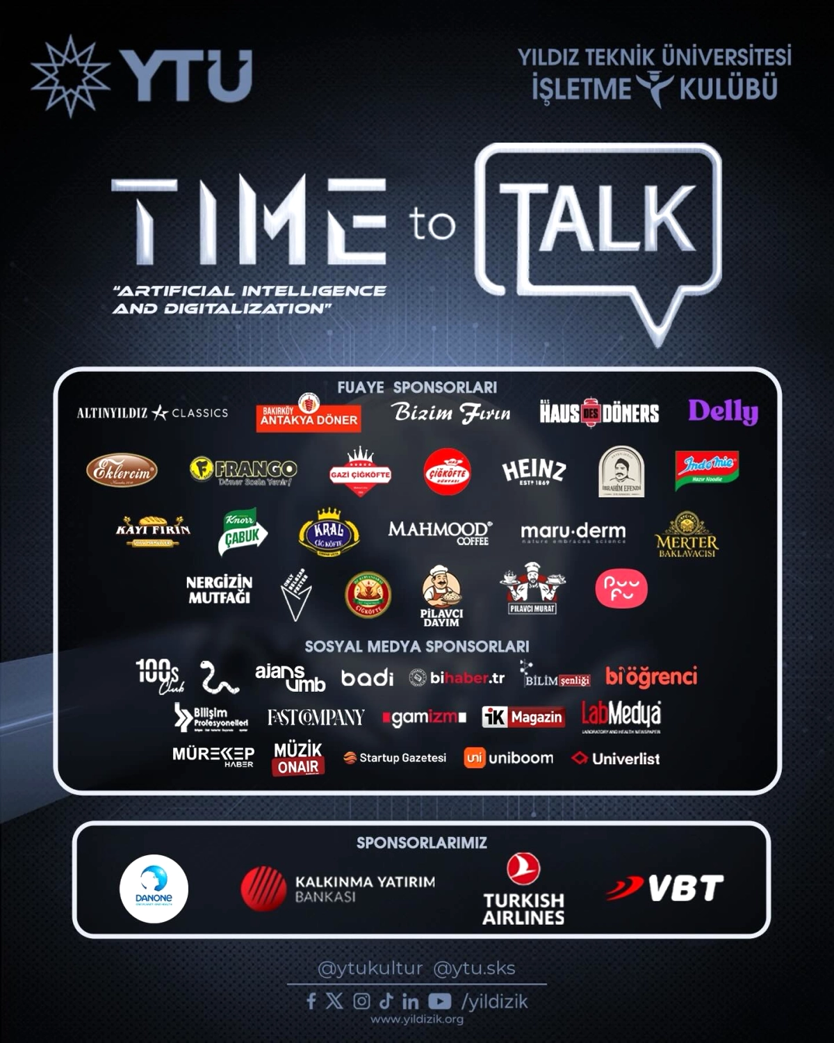 1999 yılında kurulan Yıldız İşletme Kulübü, Yıldız Teknik Üniversitesi'nin en aktif öğrenci topluluklarından biri olarak biliniyor. Türkiye'nin en köklü teknik üniversitelerinden biri olan YTÜ'de toplam 71 aktif öğrenci kulübü bulunuyor. Yıldız İşletme Kulübü, bu kulüpler arasında öğrencilerin kariyer gelişimlerine katkı sağlamak ve iş dünyasıyla bağlarını güçlendirmek amacıyla çeşitli etkinlikler düzenliyor. Time to Talk da bu etkinlikler arasında öne çıkan ve gelenekselleşen bir organizasyon.