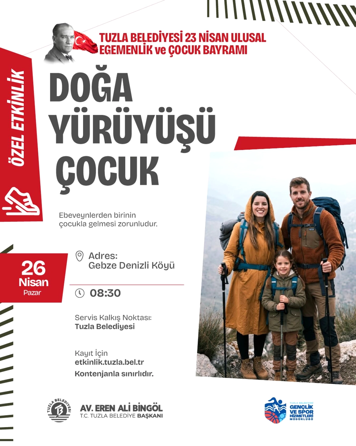 Tuzla Belediyesi, 23 Nisan Ulusal Egemenlik ve Çocuk Bayramı coşkusunu doğayla iç içe bir etkinlikle taçlandırıyor. 10-15 yaş arası çocukların katılımına açık olan doğa yürüyüşü, hem fiziksel aktivite hem de doğa bilinci kazandırmayı hedefliyor. Belediye yetkilileri, "Hem doğayla buluşacak hem de sağlıklı yaşama adım atacağız" mesajını paylaşarak aileleri bu keyifli yürüyüşe davet ediyor.